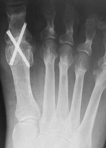 En los casos más graves, donde la articulación está severamente degenerada, se recomienda una artrodesis (fijación de la articulación). Esta técnica elimina el dolor al inmovilizar la articulación, mejorando notablemente la calidad de vida del paciente. Elegimos esta opción en aquellos casos en los que la articulación presenta una afectación muy severa. Pese a que fijamos la articulación, la marcha de los pacientes no se ve muy afectada pudiendo caminar con normalidad.
