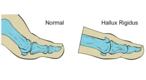 El Hallux Rigidus es una degeneración (artrosis) que afecta el cartílago de la articulación metatarsofalángica (MTF) del dedo gordo del pie. A diferencia del juanete, que es más frecuente en mujeres, esta el hallux rigidus predomina en hombres. Mientras que el hallux valgus implica una desviación del dedo gordo, el Hallux Rigidus se caracteriza por la rigidez en la movilidad y el dolor como consecuencia de un deterioro directo del cartílago articular. Como hemos señalado, el hallux rigidus es una artrosis en la articulación MTF.