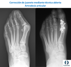 - Cirugía abierta: Dentro de la cirugía abierta existen muchísimas técnicas que pueden emplearse. La ventaja principal es que la corrección anatómica y radiográfica suele ser superior a la otra técnica, logrando una corrección exacta. La principal desventaja es que, al ser una técnica abierta, aumenta el daño a la piel y el tejido blando, aumentando el riesgo de infección, de problemas con la piel y la rigidez postoperatoria.