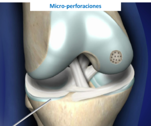 Las microperforaciones las usamos si en una zona de lesión pequeña no queda cartílago del paciente. El objetivo es que esa zona “muerta” a la que no llega sangre que pueda reparar la lesión, vuelva a tener viabilidad y se regenere un cartílago nuevo que cubra toda la lesión. Este cartílago es útil, aunque diferente al origina de la rodilla. A estos dos tratamientos es posible añadirle células madre mesenquimales o plasma, para intentar aportar mayor viabilidad y capacidad de curación al tratamiento.